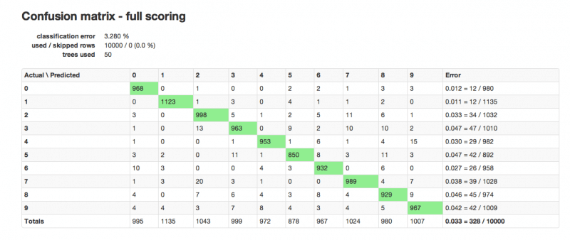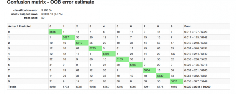 Results: In an RF model of 50 trees, features set to 200, and all other options left in default, H2O produces this confusion matrix.