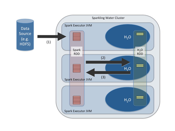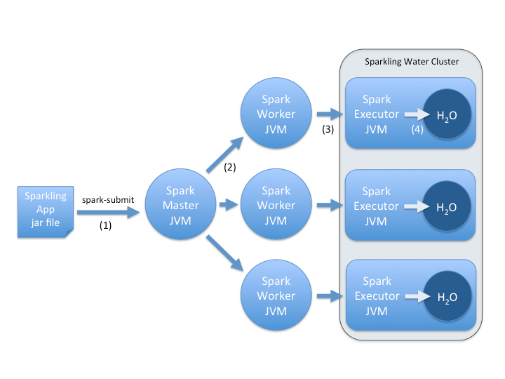 Step (4) shows each Executor starting an H2 O instance within the Executor. This H2 O instance shares the JVM heap with the Executor (since it is embedded), but creates its own Fork/Join threads for CPU work. The Sparkling Water cluster fully forms once all the Spark Executor JVMs bring up their embedded H2 O instances. This requires a rendezvous point and is one of the tricky aspects of implementing the integration (since many Spark operations are lazy). Essentially the application launch process needs a barrier to make sure the Sparkling Water cluster is fully formed before it can do any work. How to do this is one of the interesting discussion points in JIRA SPARK-3270.