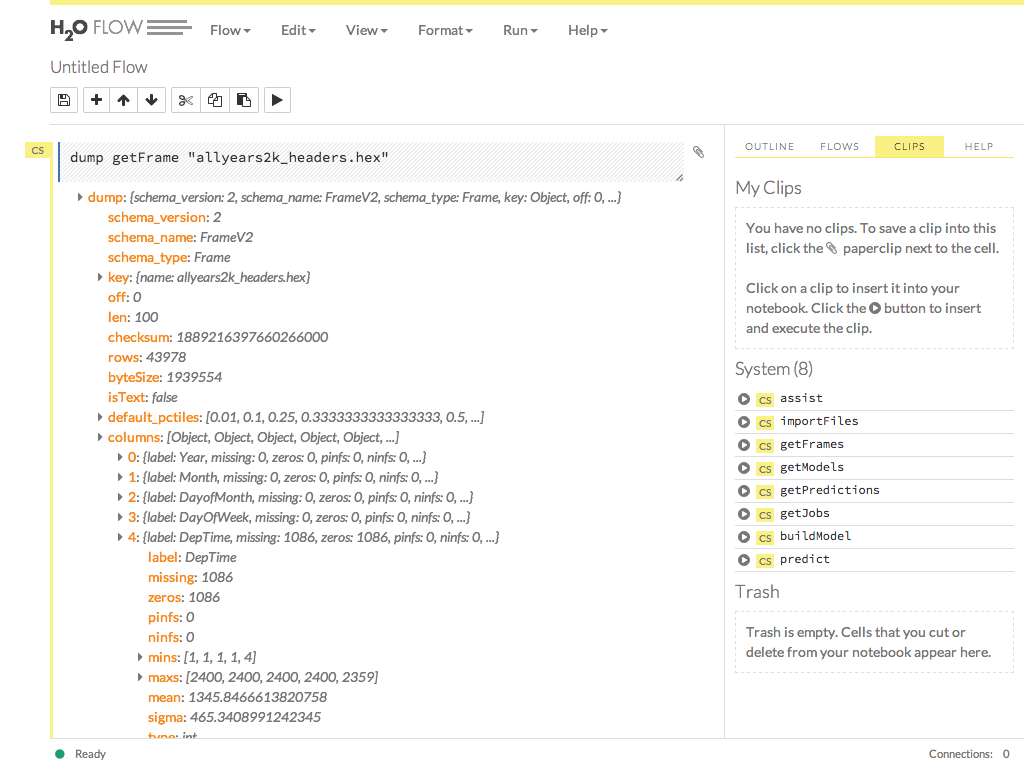 You can inspect raw H2O objects with dump(). Commonly used commands are available in the form of executable clips. You can add more clips to this list to build up a repository of your commonly used snippets.