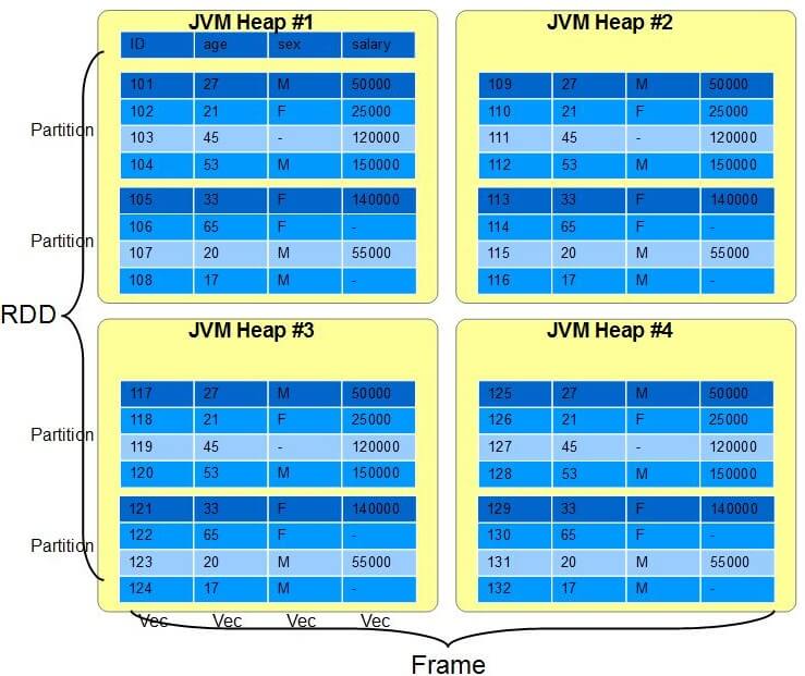 In Scala, this is typed as RDD[User], and we’ll have 1 User object per realUser, blocked in Partitions around the cluster. In H2 O, DataFrames naturallyhold all numeric types and missing values in a column format; we’ll have 4columns each holding a value for each user again distributed in Chunks aroundthe cluster. Here’s a single Partition hold 4 users, and showing 4 Chunks (oneper column):