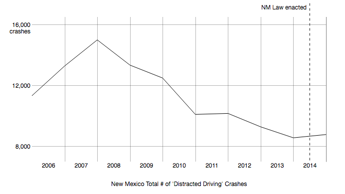 Did these laws end up working? Well, maybe. If we look at all crashes (not just fatal ones) in New Mexico from 2005 to 2014, the general trend was downward post-2007, seemingly leveling out during 2014. Unfortunately, data from 2015 on the total number of crashes in New Mexico isn’t available and so we aren’t able to examine whether the bill ended up succeeding in terms of reducing all crashes due to distracted driving.