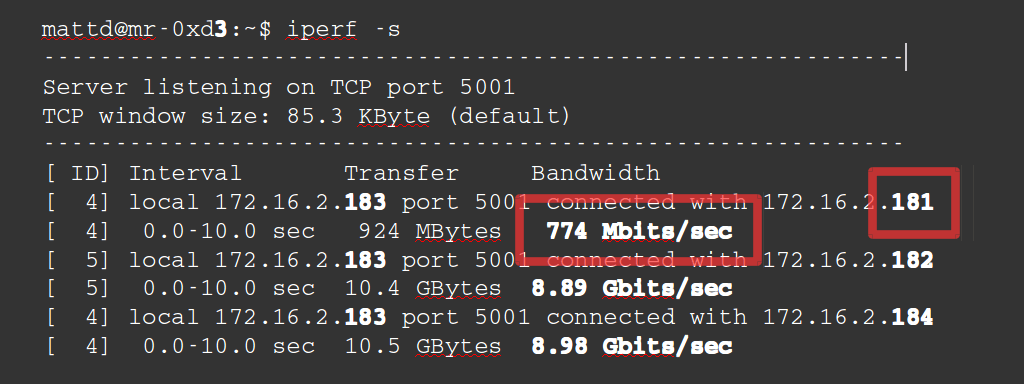There doesn’t appear to be much wrong here. I asked colleagues and they advised to more thoroughly check the network speeds as they’d seen problems in the past. I Googled for how to test network speed which quickly returned iperf. I knew the problem might be server 1 so I chose server 3 to be the server and compared speeds from servers 1, 2 and 4 as clients to server 3 as the server. Here’s the result :