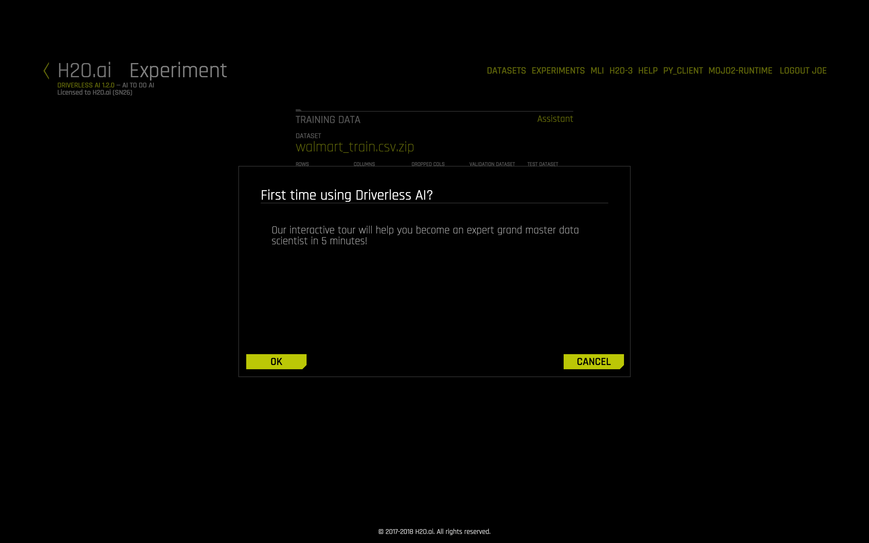 Once you have your data prepared in tabular format (see raw data above), Driverless AI can formulate it for machine learning and sort out the rest. If this is your very first session, the Driverless AI assistant (new feature in version 1.2) will guide you through the journey.