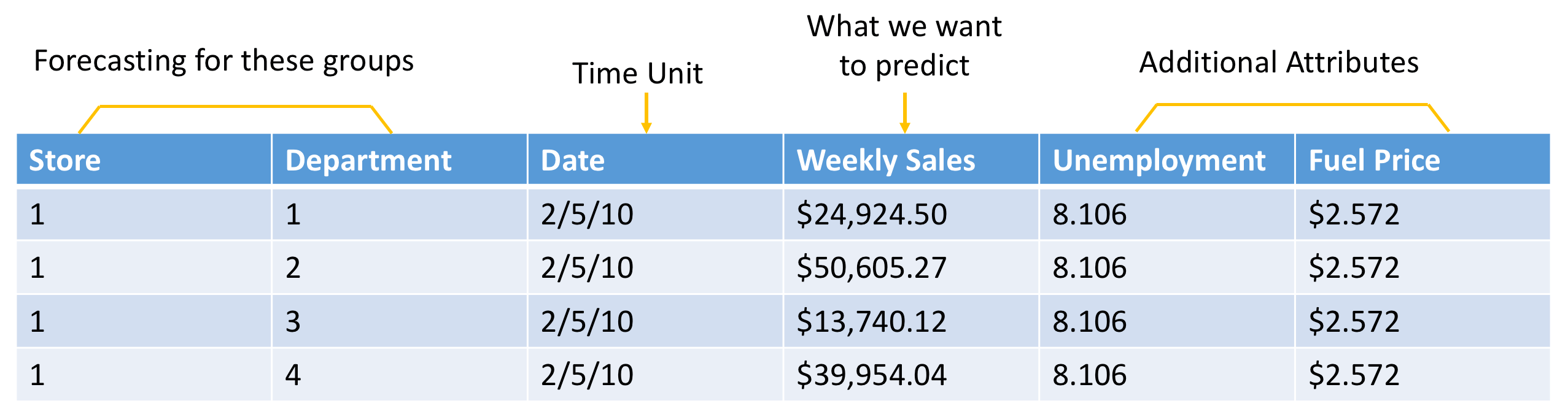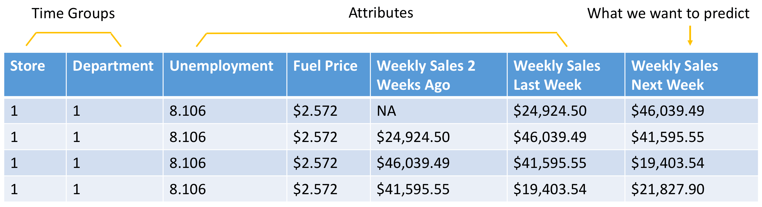Below is a typical example of sales forecasting based on Walmart competition on Kaggle . In order to frame it as a machine learning problem, we formulate the historical sales data and additional attributes as shown below: