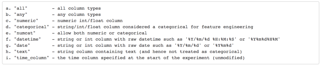 Please note that if col_type is set to col_type=all then all the columns in the dataframe are provided to this transformer, no selection of columns will occur.