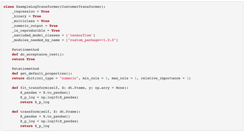 CustomTransformer Base class that needs to be extended for one to write a recipe. The CustomTransformer class provides one the ability to add a customized transformation function. In the following example, we are going to create a transformer that will transform a column with the log10 of the same column. The new column, which is transformed by log10 will be returned to DriverlessAI as a new column that will be used for modeling.