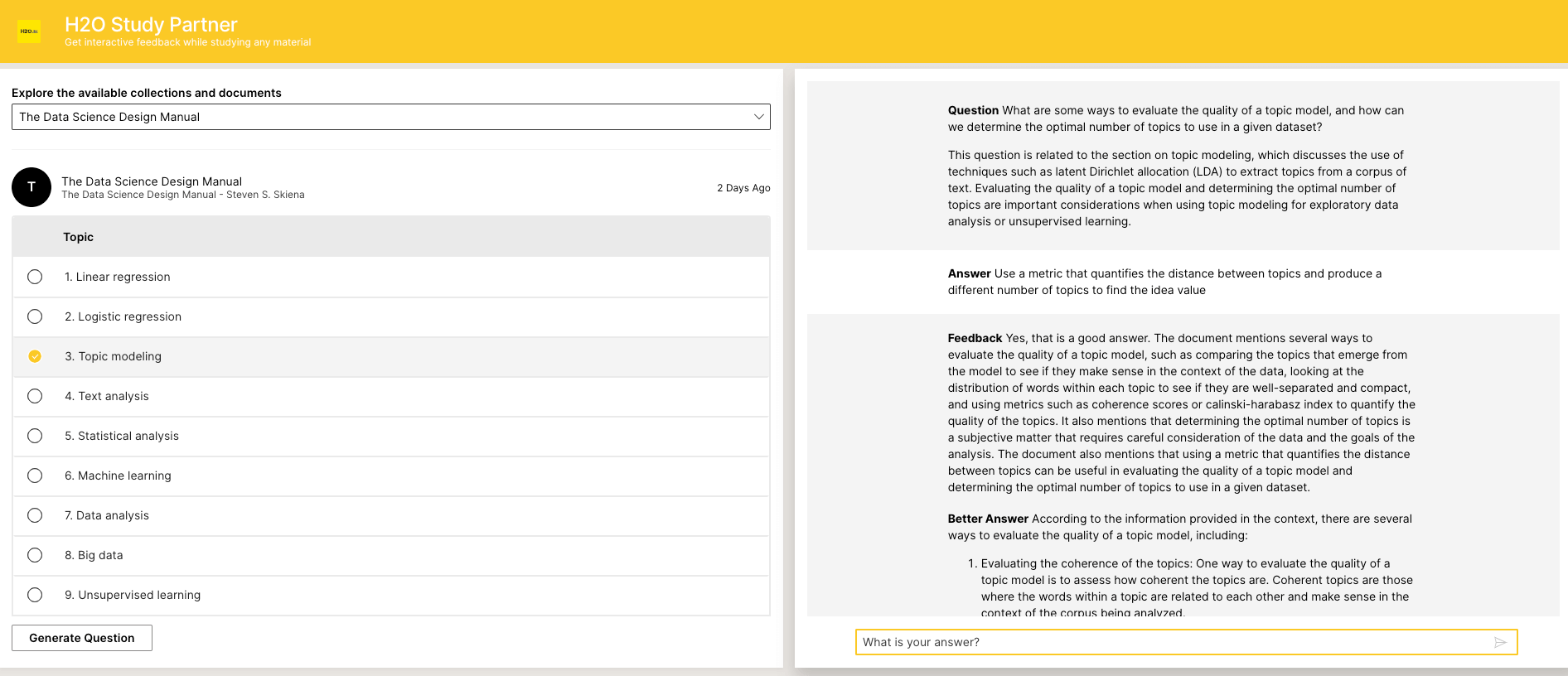 The Study Partner app can run on any collection of documents and helps you learn more about the content by generating topics on the collection and then quizzing you with custom study questions on the topic of your choice. Users receive immediate feedback and tips on how to improve. In the H2O GenAI App Store, we have documents about the H2O Products, but this app could run on any collection of documents.