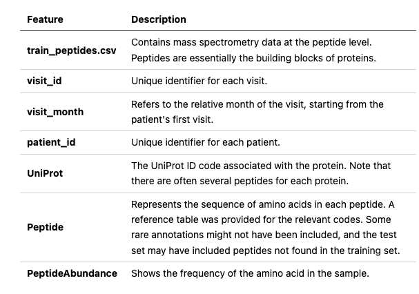 The dataset was primarily composed of protein abundance levels obtained from mass spectrometry readings of cerebrospinal fluid (CSF) samples collected from hundreds of patients over several years. This competition was unique in that it was a time-series code contest, where predictions were made using Kaggle’s time-series API on provided test set data. The data used in the competition was organized as follows: