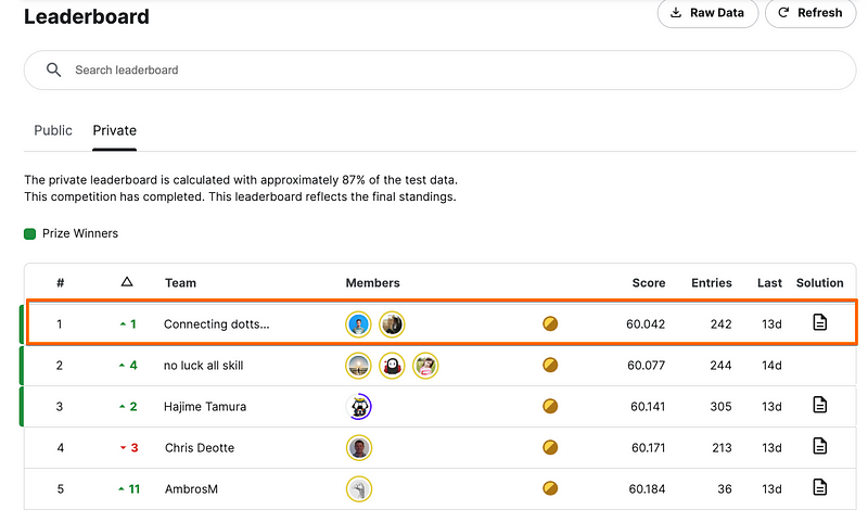 The full code of the winning notebook can be found here, while an elaborate solution provided by the team can be found here.