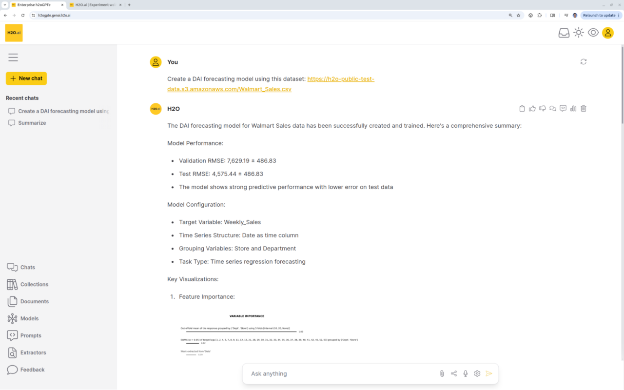 Enterprise h2oGPTe easily runs DriverlessAI or other machine learning platforms, including for time-series forecasting, from a simple prompt, providing results, insights, and recommendations.