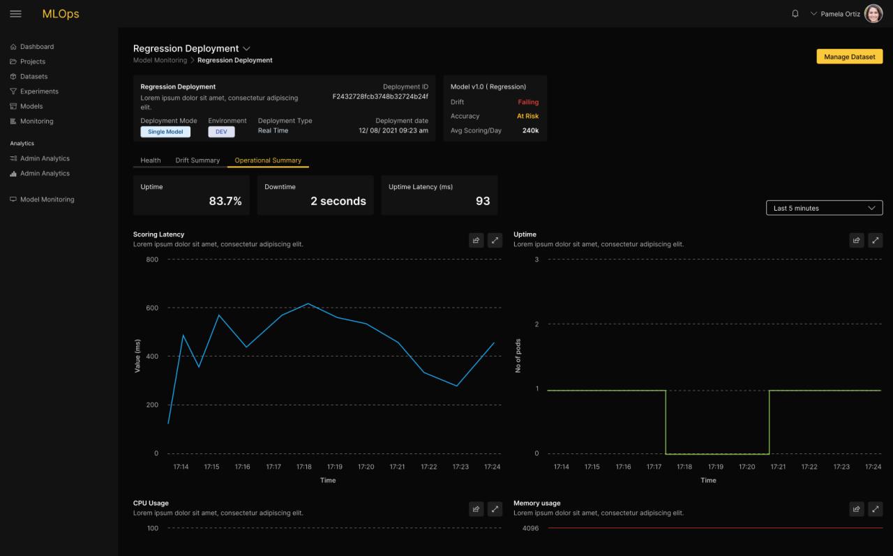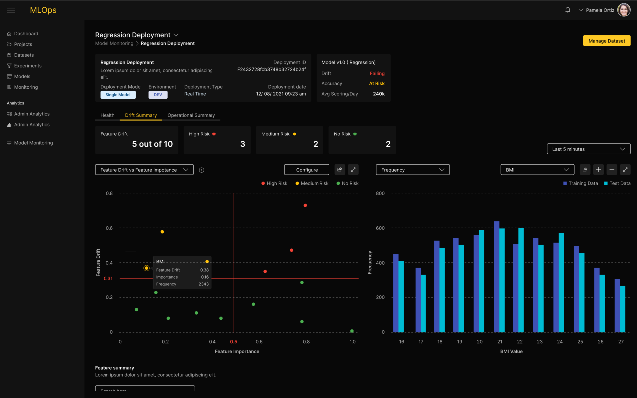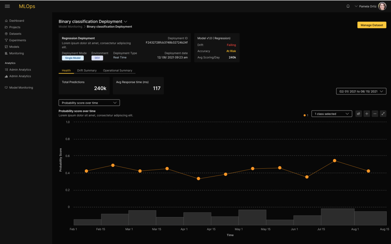 In general, model performance is known to degrade over time. Businesses wishing to maximize the performance of their applications need to monitor the performance of the models to detect the optimal moment for swapping in new models. H2O MLOps includes real-time monitoring of models for detecting anomalies, drift, accuracy, and fairness degradation. IT teams are also able to monitor their operational metrics Metrics and alerts are presented in a real-time dashboard, allowing Data Scientists to dive in deeper to gain a complete understanding. The alerting capabilities of H2O MLOps allow teams to be notified when discoveries are made. With built-in integrations, teams are kept in the know with real-time alerts. When the threshold and anomalies are triggered alerts will be sent to the dashboard. The Data Scientist can configure automatic model retraining, in case a particular metric falls below a threshold.